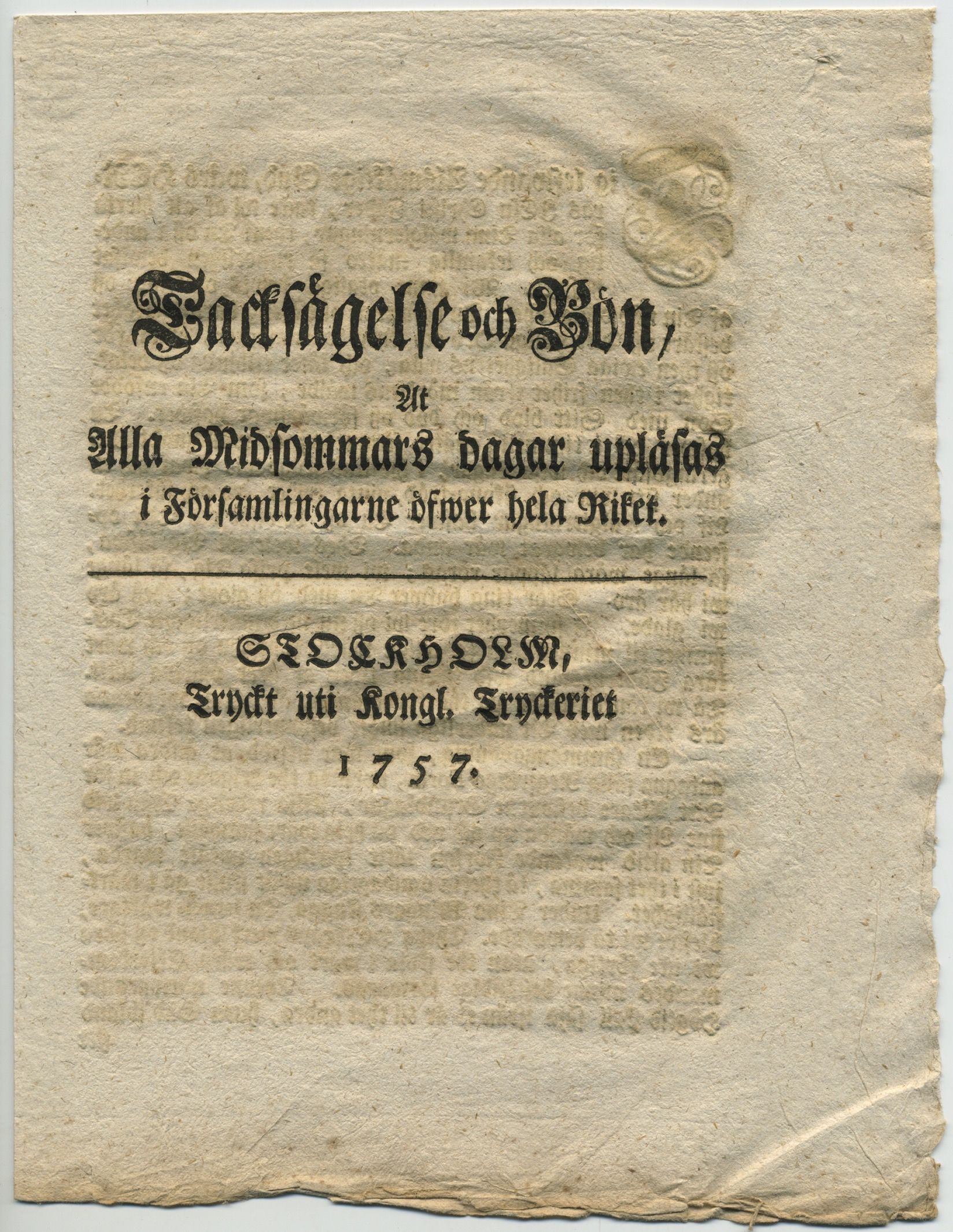 Tacksägelse och bön, at alla midsommars dagar upläsas i församlingarne öfwer hela riket.