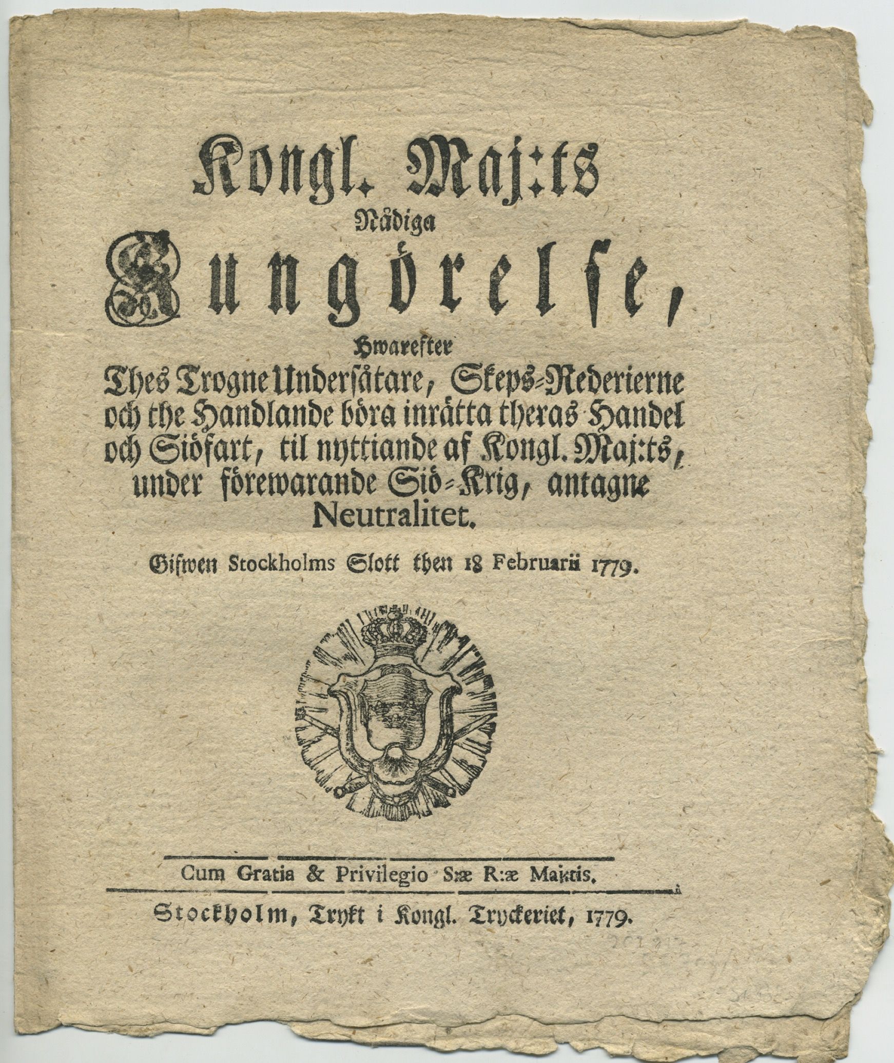 Kongl. maj:ts nådiga kungörelse, hwarefter thes trogne undersåtare, skeps-rederierne och the handlande böra inrätta theras handel och siöfart, til nyttiande af kongl. maj:ts, under förewarande siö-krig, antagne neutralitet. Gifwen Stockholms slott then 18 februarii 1779.