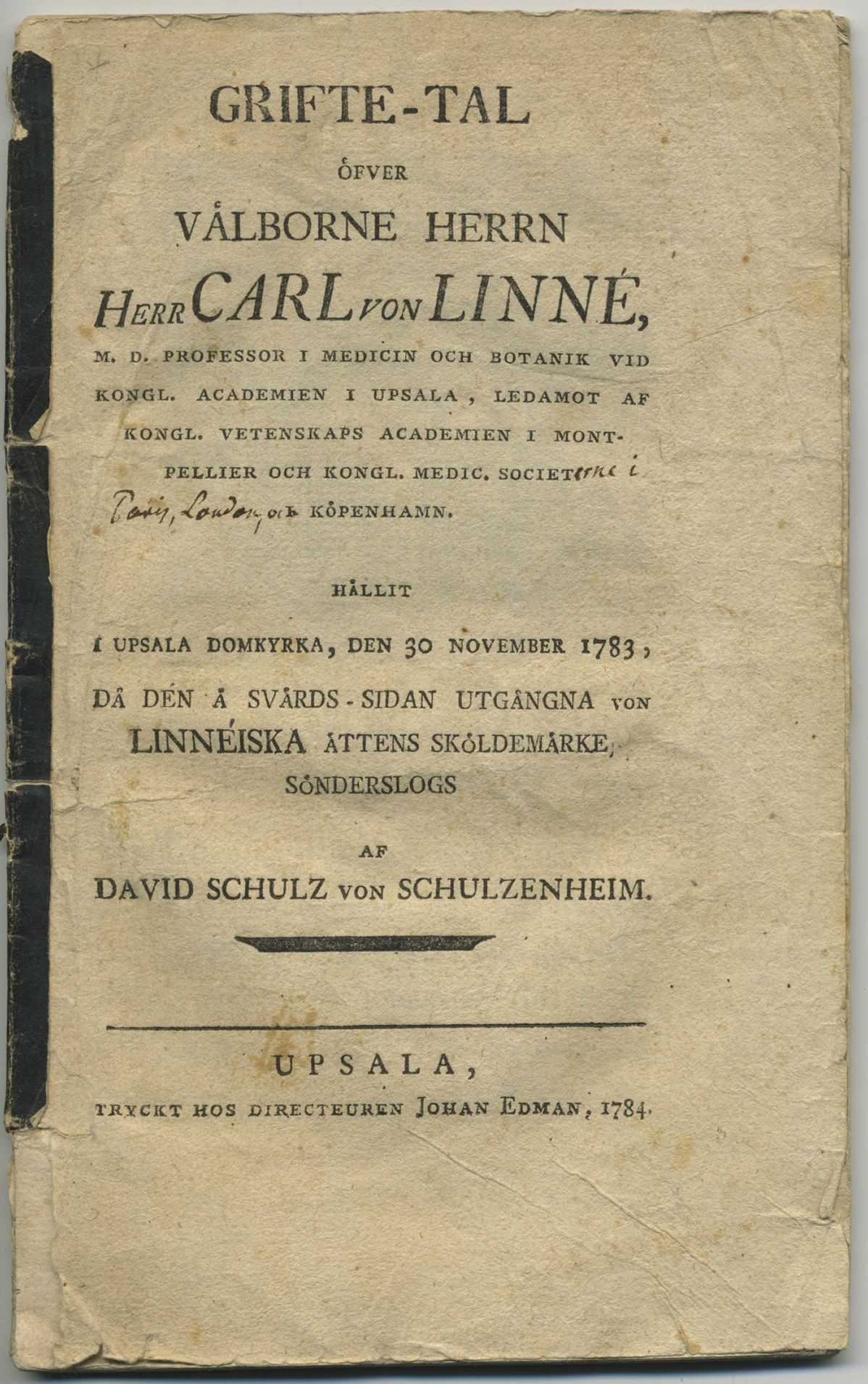 Grifte-tal öfver välborne herrn herr Carl von Linné, m.d. professor i medicin och botanik vid kongl. academien i Upsala, ledamot af kongl. vetenskaps academien i Montpellier och kongl. medic. societ. i Köpenhamn hållet i Upsala domkyrka, den 30 november 1783, då den å svärds-sidan utgångna von Linnéiska ättens sköldemärke sönderslogs.