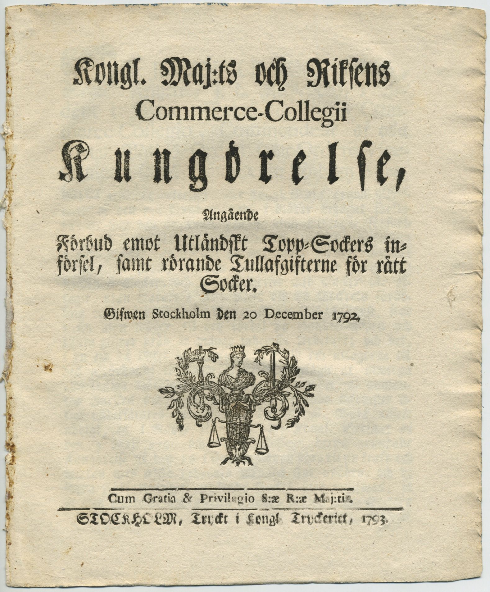 Kongl. maj:ts och riksens Commerce-collegii kungörelse, angående förbud emot utländskt topp-sockers införsel, samt rörande tullafgifterne för rått socker. Gifwen Stockholm den 20 december 1792.