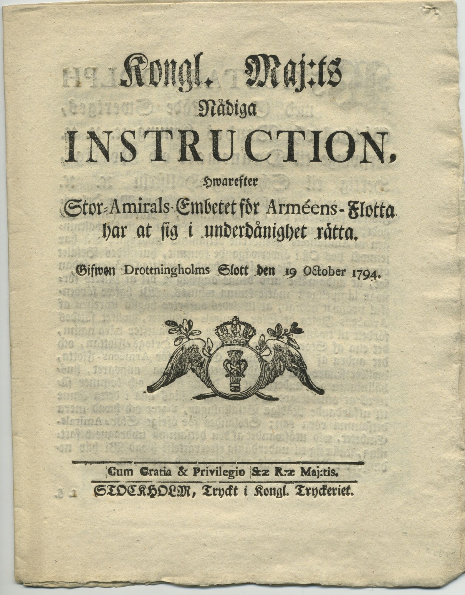 Kongl. maj:ts nådiga instruction, hwarefter stor-amirals-embetet för arméens-flotta har at sig i underdånighet rätta. Gifwen Drottningholms slott den 19 october 1794.