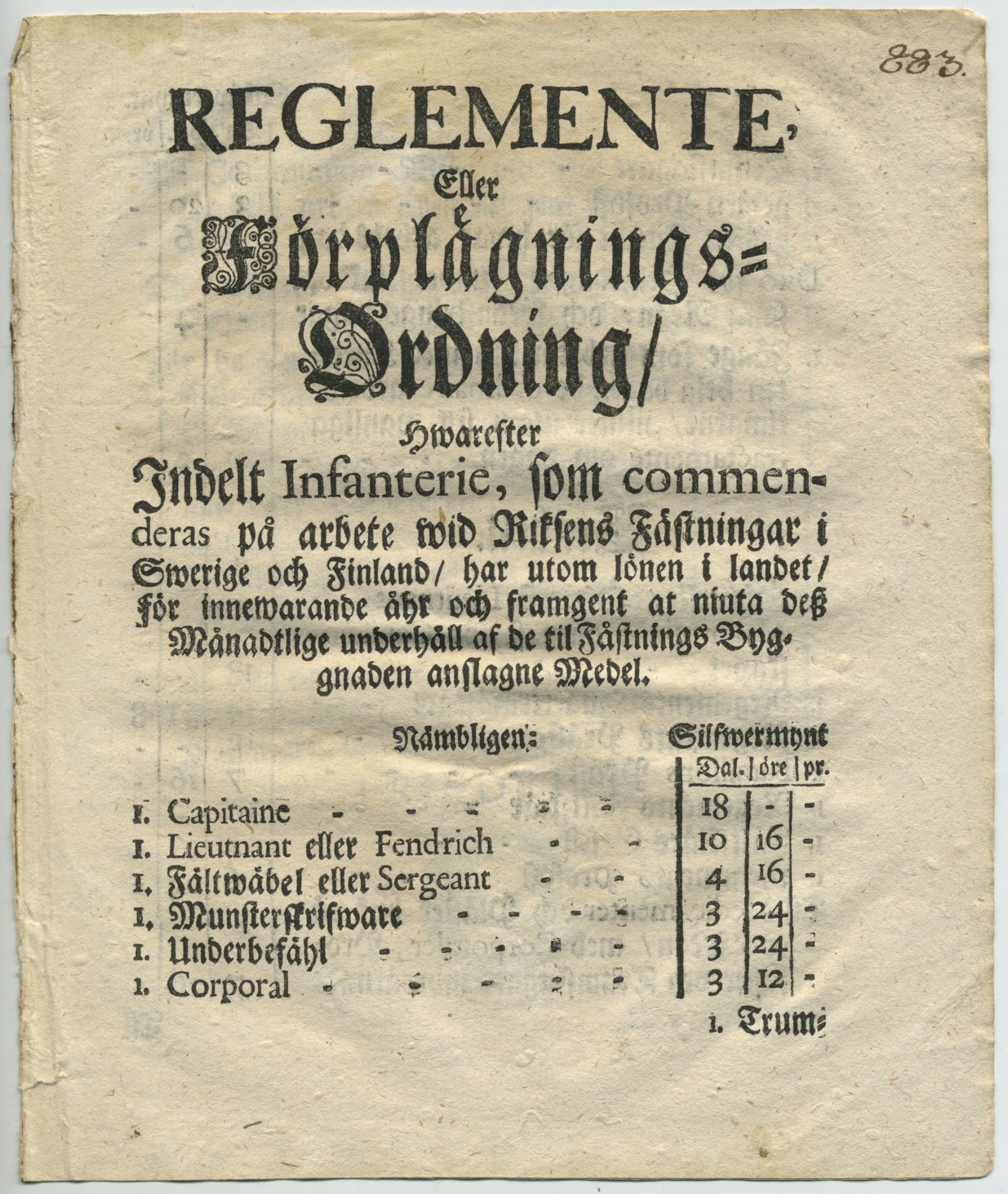 Reglemente, eller förplägnings-ordning/ hwarefter indelt infanterie, som commenderas på arbete wid riksens fästningar i Swerige och Finland/ har utom lönen i landet/ för innewarande åhr och framgent at niuta dess månadtlige underhåll af de til fästnings bygnaden anslagne medel. [=rubrik].