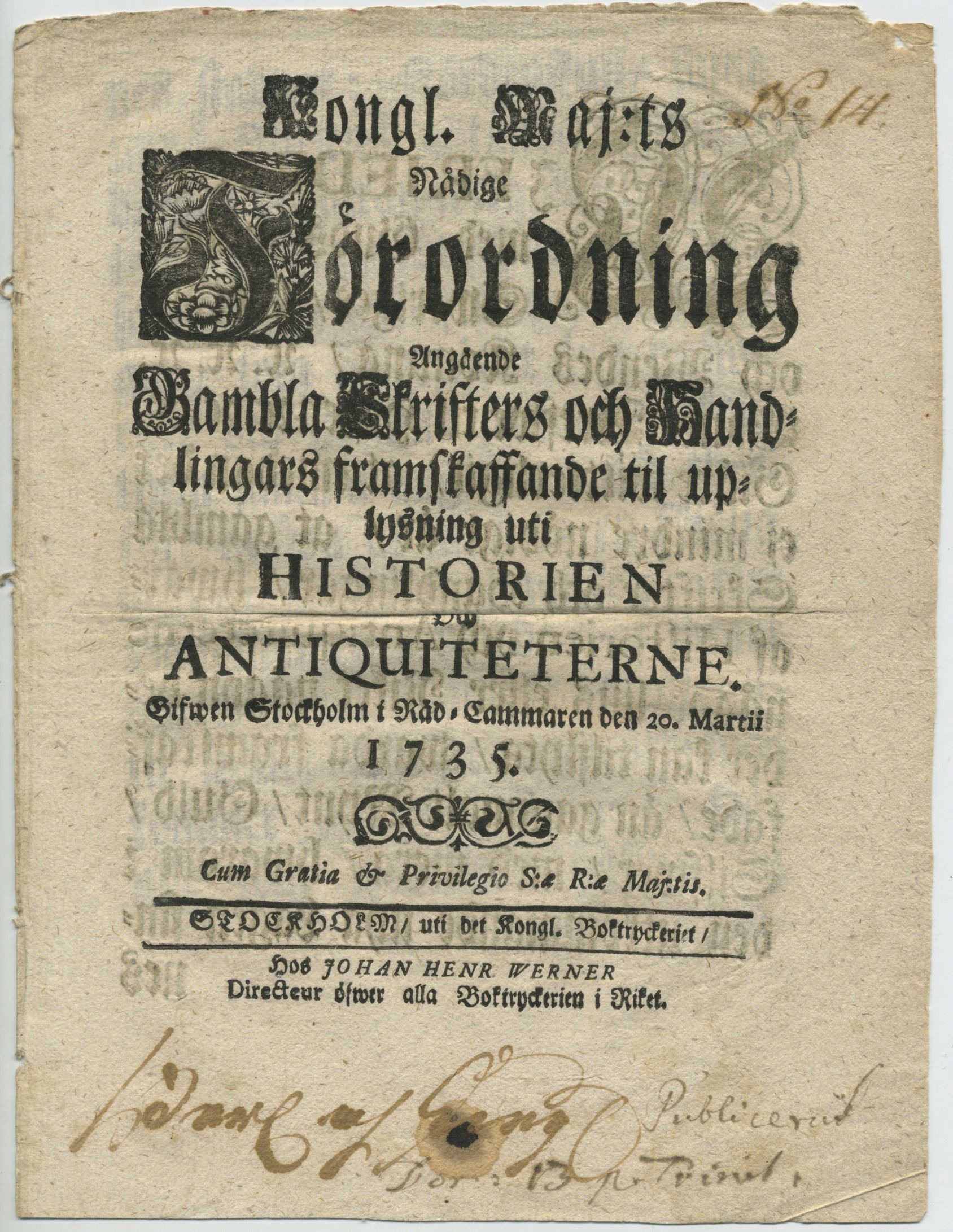 Kongl. maj:ts nådige förordning angående gambla skrifters och handlingars framskaffande til upplysning uti historien och antiquiteterne. Gifwen Stockholm i råd-cammaren den 20 martii 1735.