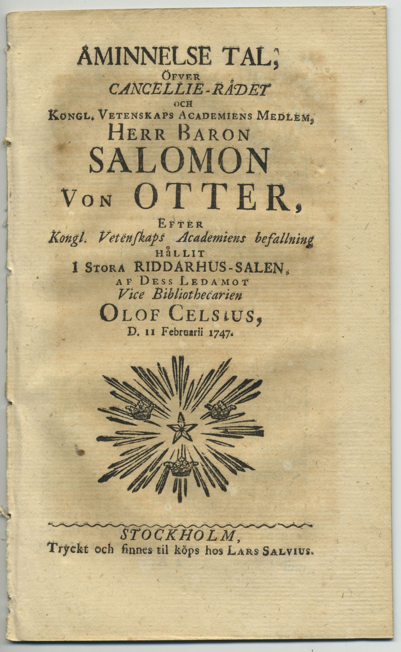 Åminnelse tal, öfver cancellie rådet kongl. Vetenskaps academiens medlem, herr baron Salomon von Otter, efter kongl. Vetenskaps academiens befallning hållit i stora Riddarhus-salen, af des ledamot [...] d. 11 februarii 1747.