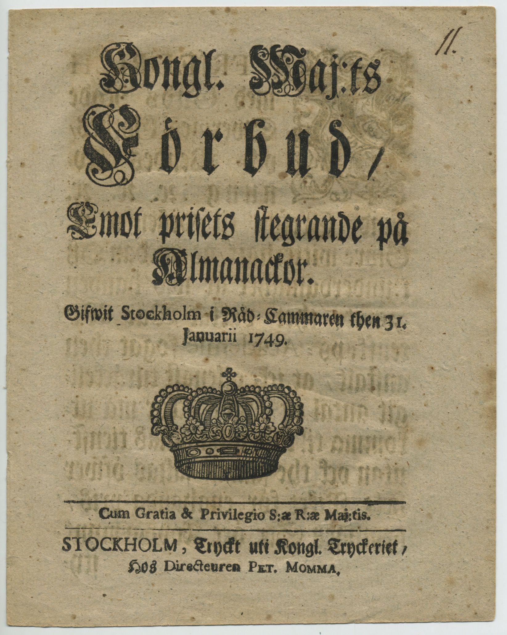Kongl. maj:ts förbud/ emot prisets stegrande på almanackor. Gifwit Stockholm i råd-cammaren then 31 januarii 1749.