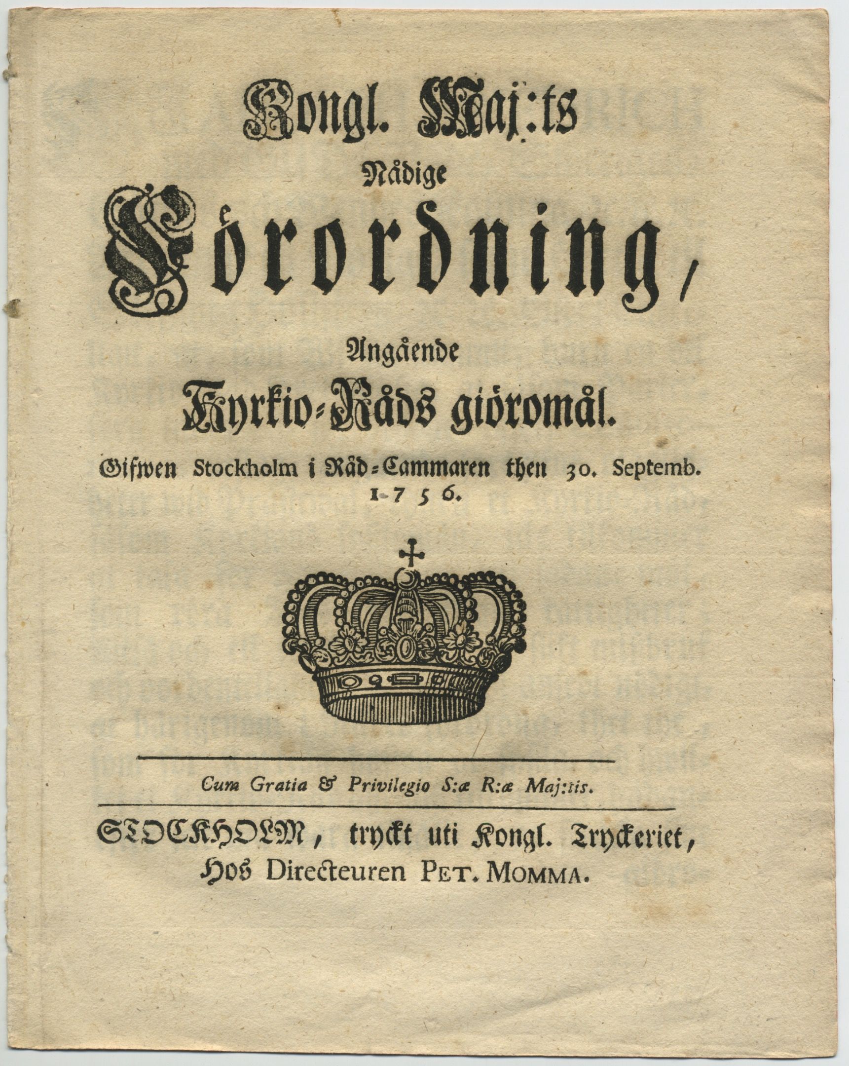 Kongl. maj:ts nådige förordning, angående kyrkio-råds giöromål. Gifwen Stockholm i råd-cammaren then 30 septemb. 1756.