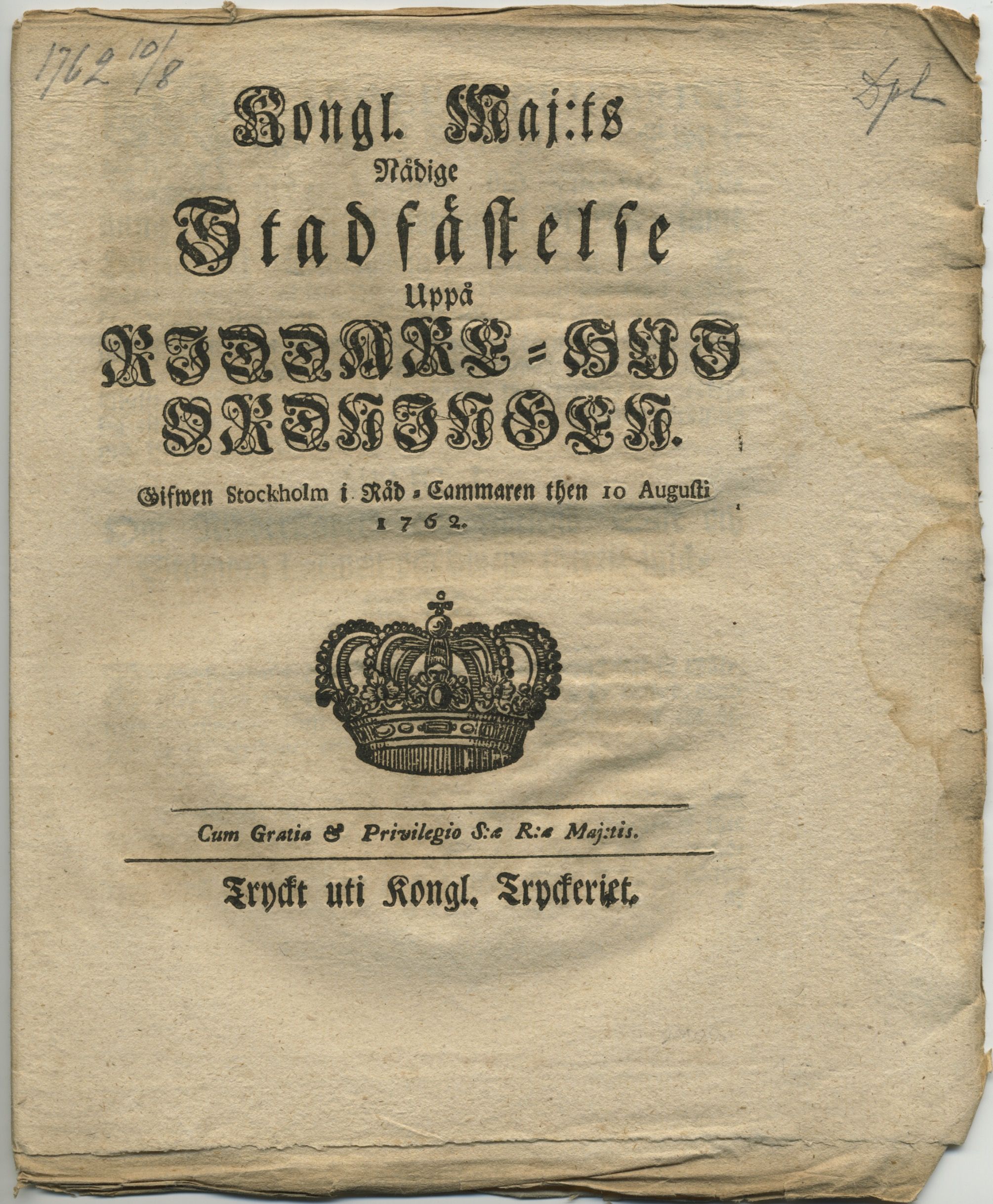 Kongl. maj:ts nådige stadfästelse uppå Riddare-hus ordningen. Gifwen Stockholm i råd-cammaren then 10 augusti 1762.
