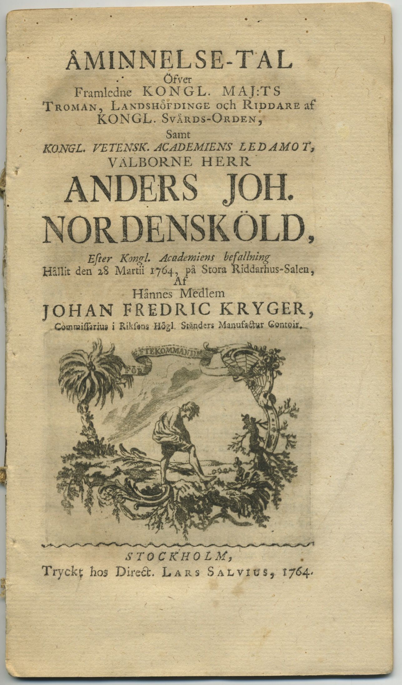 Åminnelse-tal öfver framledne kongl. maj:ts troman, landshöfdinge och riddare av kongl. Svärds-orden, samt kongl. Vetensk. academiens ledamot, välborne herr Anders Joh. Nordensköld, efter kongl. academins befallning hållit den 28 martii 1764, på stora riddarhus-salen, af hännes medlem.