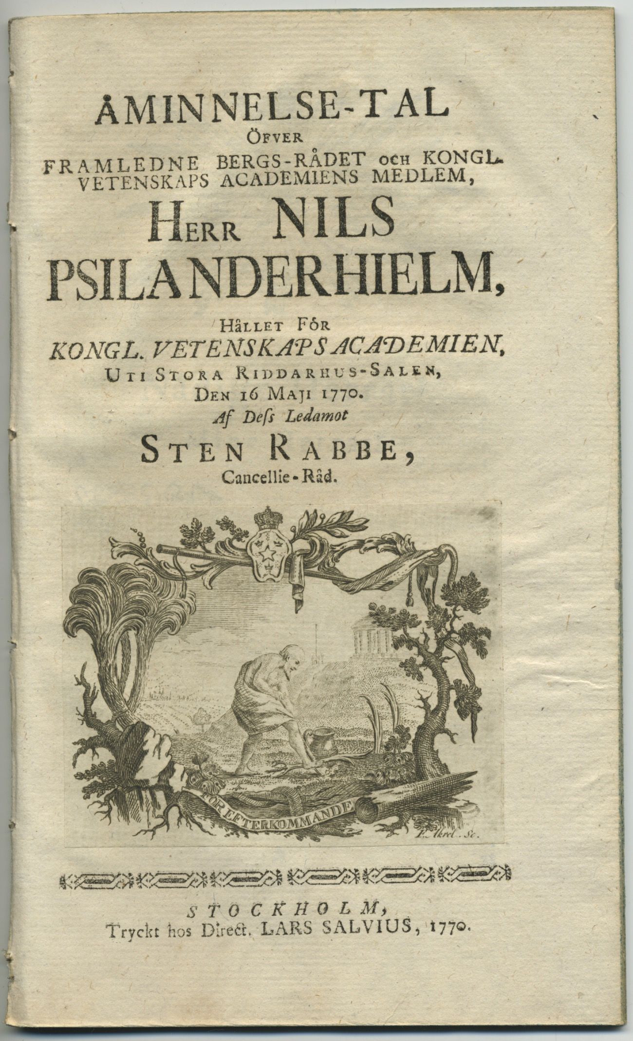 Åminnelse-tal öfver framledne bergs-rådet och kongl. Vetenskaps academiens medlem, herr Nils Psilanderhielm, hållet för kongl. Vetenskaps academien, uti stora riddarhus-salen, den 16 maji 1770 af dess ledamot.