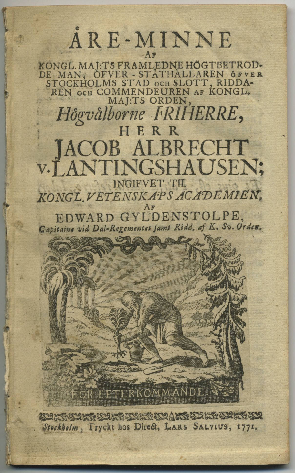 Äre-minne af kongl. maj:ts framledne högtbetrodde man, öfver-ståthållaren öfver Stockholms stad och slott, riddaren och commendeuren af kongl. maj:ts orden, välborne friherre, herr Jacob Albrecht v. Lantingshausen; ingifvet til kongl. Vetenskaps academien.