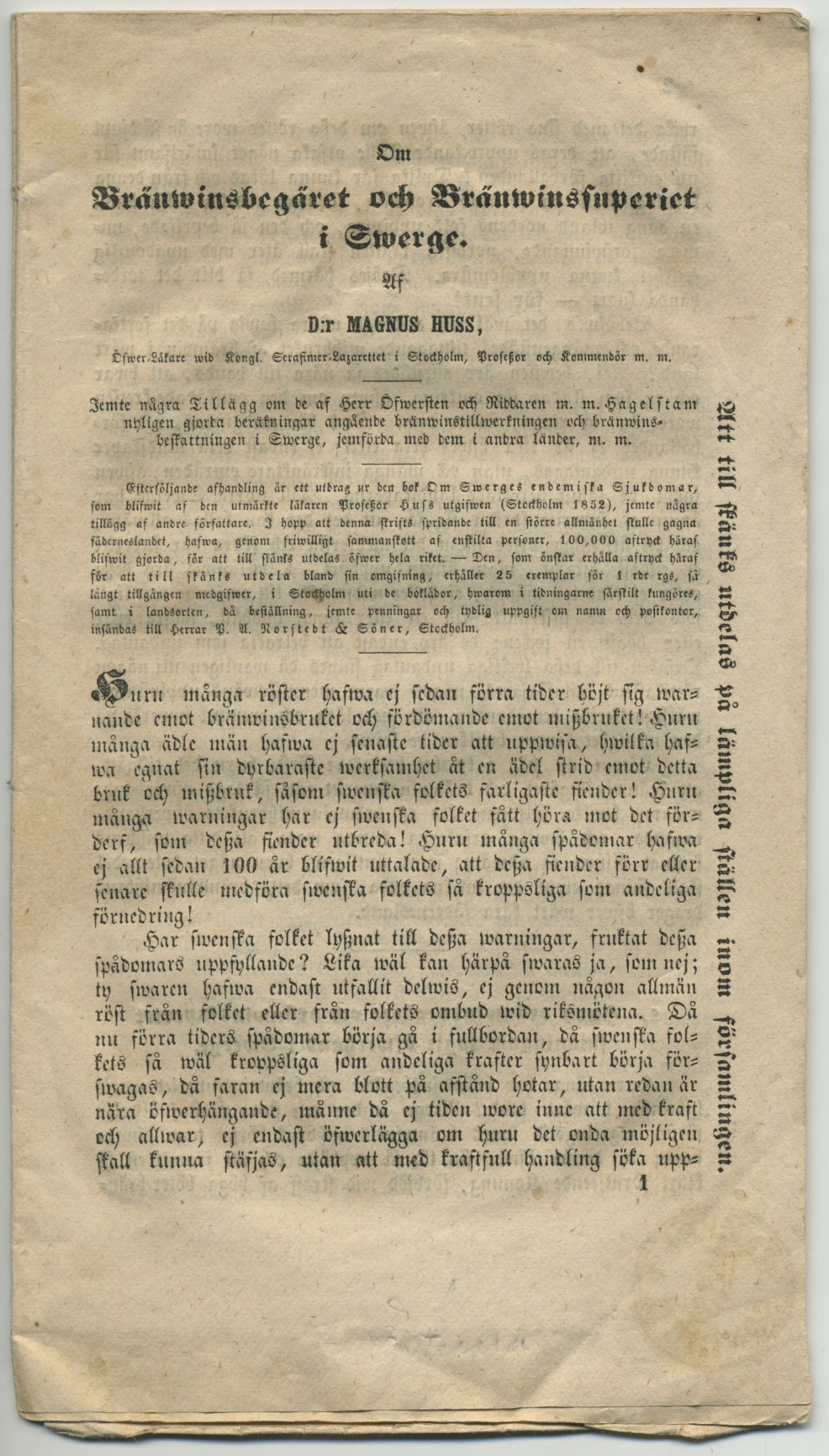 Bibliotheca Walleriana 5013. Utdrag ur författarens arbete ”Om Sveriges endemiska sjukdomar” jämte tillägg ur andra författares arbeten. Trycktes i 30000 exemplar och utdelades gratis. Översattes till finska av Isak Grape samma år. Innehåller även på sidorna 23-24 ”Den lärde swensken Linnés yttrande om bränwinet redan på 1700-talet”.