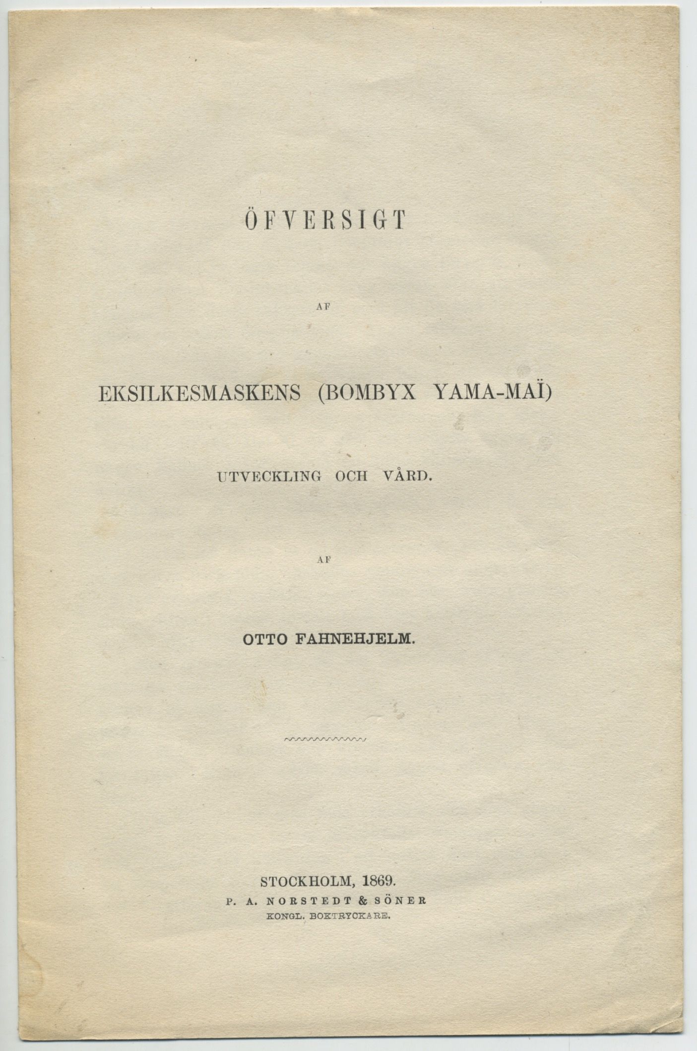 Med en illustration i texten på sidan 7 signerad "G. De V:" [de Vylder?]. Otto Fahnehjelm var verksam i ”Sällskapet för inhemsk silkesodling”.