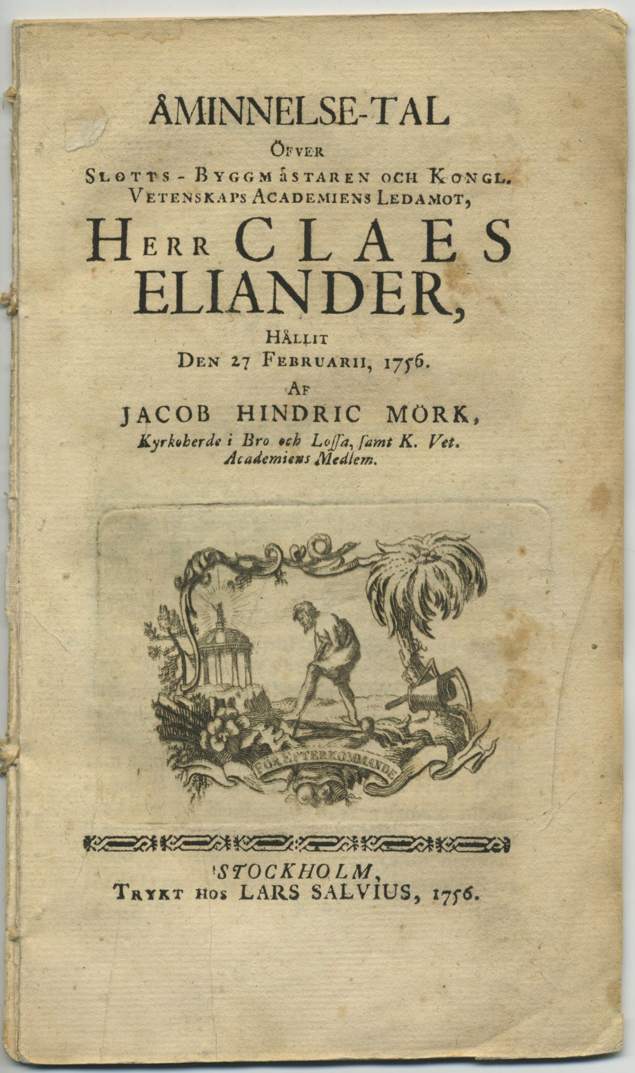 Åminnelse-tal öfver slotts-byggmästaren och kongl. Vetenskaps academiens ledamot, herr Claes Eliander, hållit den 27 februarii, 1756.
