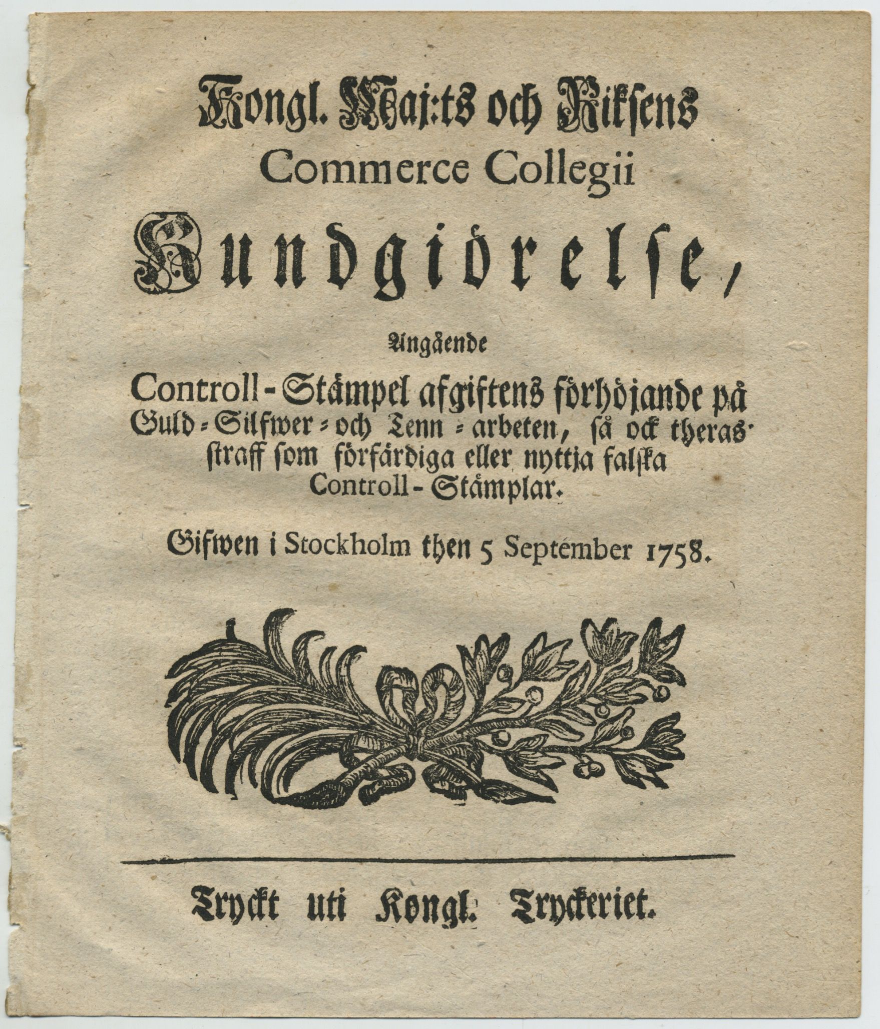 Kongl. maj:ts och riksens Commerce collegii kundgiörelse, angående controll-stämpel afgiftens förhöjande på guld- silfwer och tenn-arbeten, så ock theras straff som förfärdiga eller nyttja falska controll-stämplar. Gifwen i Stockholm then 5 september 1758.