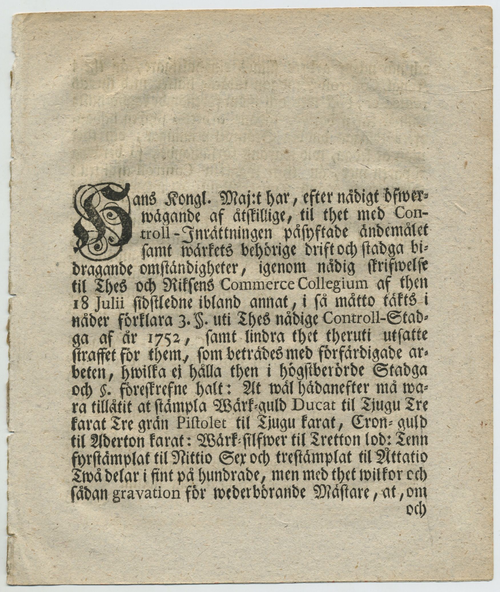 Brev utfärdat av Kommerskollegium innehållande ”förklaring öfwer åtskillige omständigheter” i kontrollstadgan af 1752.