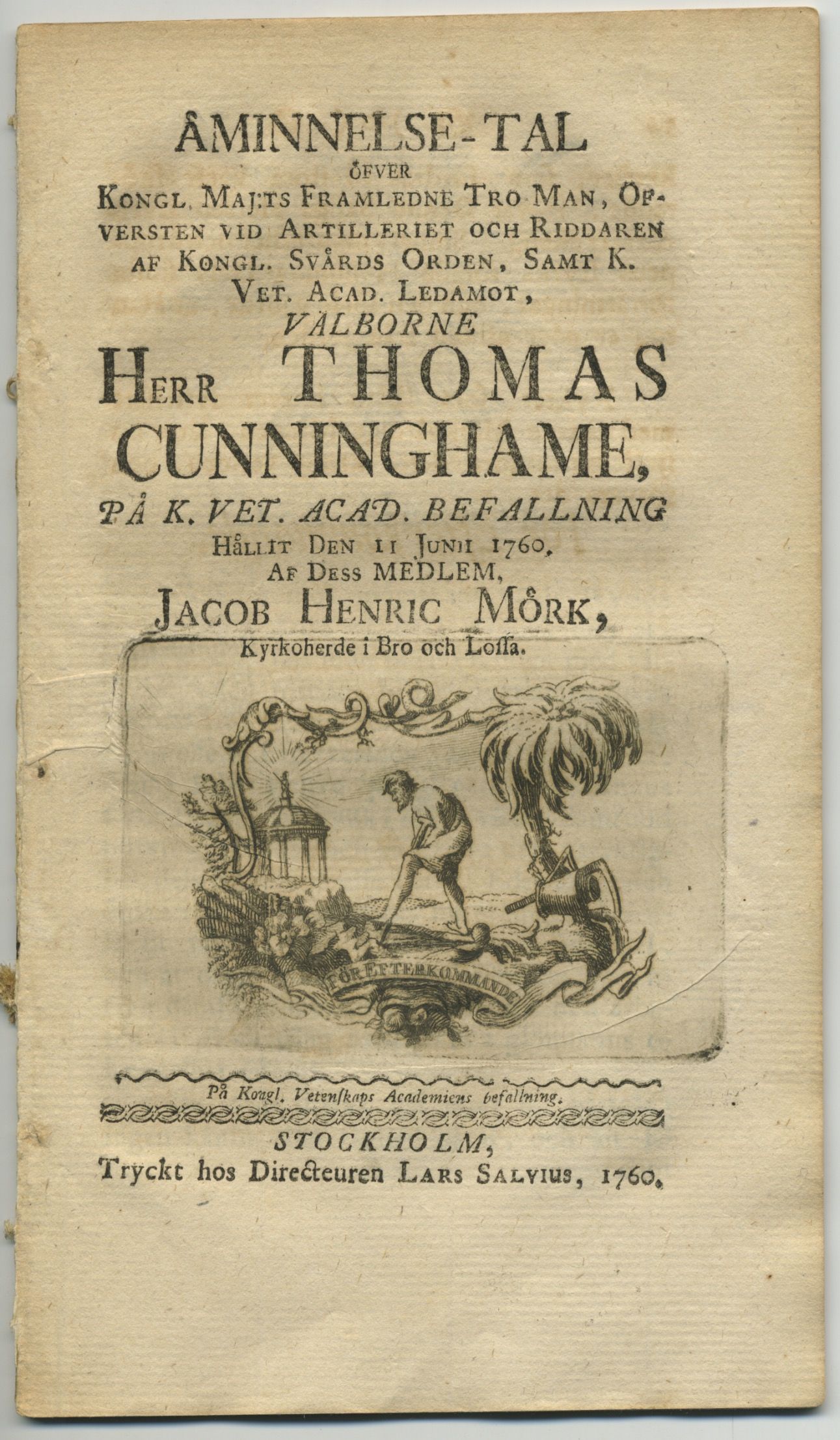 Åminnelse-tal öfver kongl. maj:ts framledne tro-man, öfversten vid artilleriet och riddaren af kongl. Svärds orden, samt k. Vet. acad. ledamot, välborne herr Thomas Cunninghame, på k. Vet. acad. befallning hållit den 11 junii 1760 af dess medlem.
