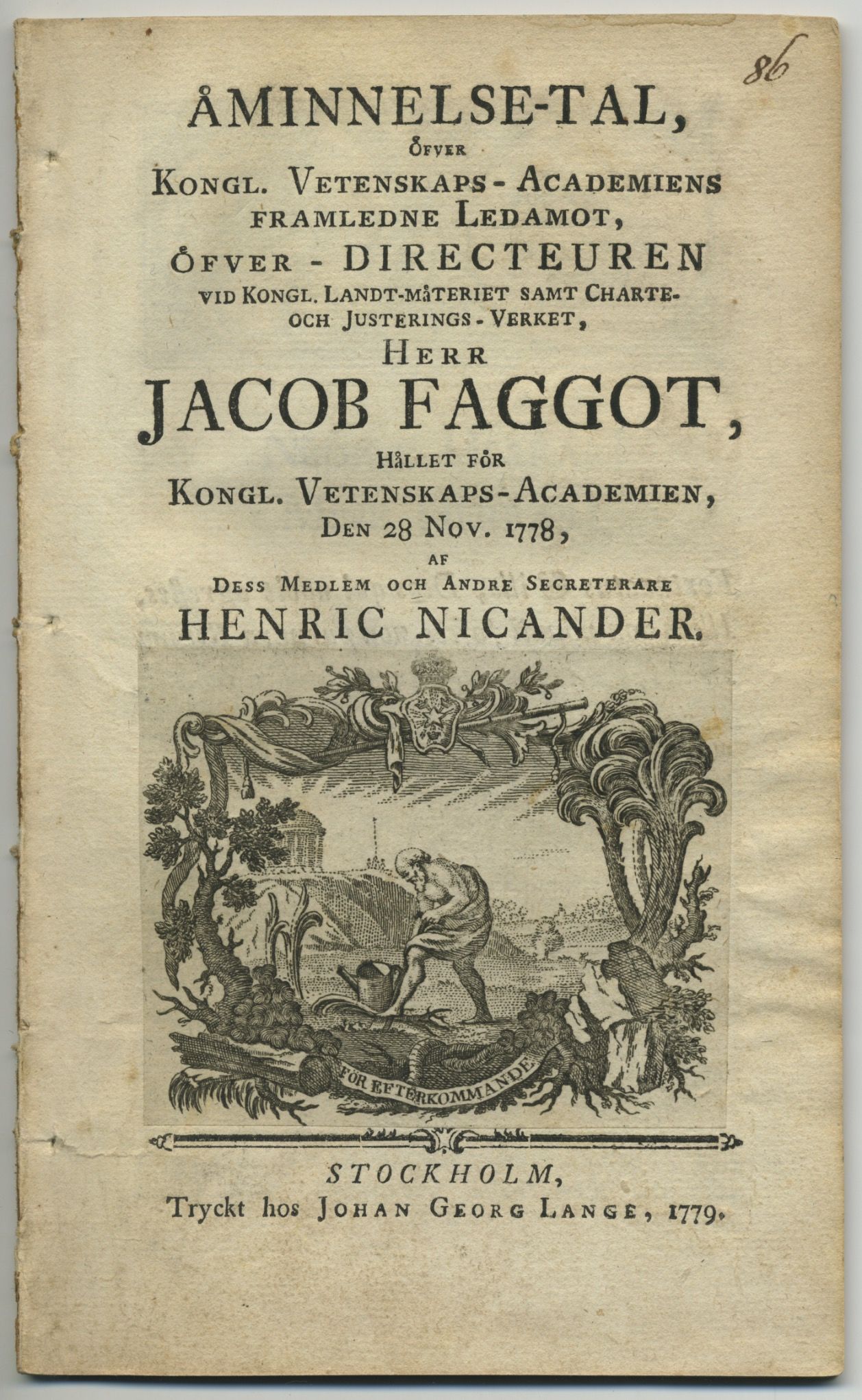 Åminnelse-tal, öfver kongl. Vetenskaps-adacemiens framledne ledamot, öfver-directeuren vid kongl. Landt-mäteriet samt charte- och justerings-verket, herr Jacob Faggot, hållet för kongl. Vetenskaps-academien, den 28 nov. 1778.
