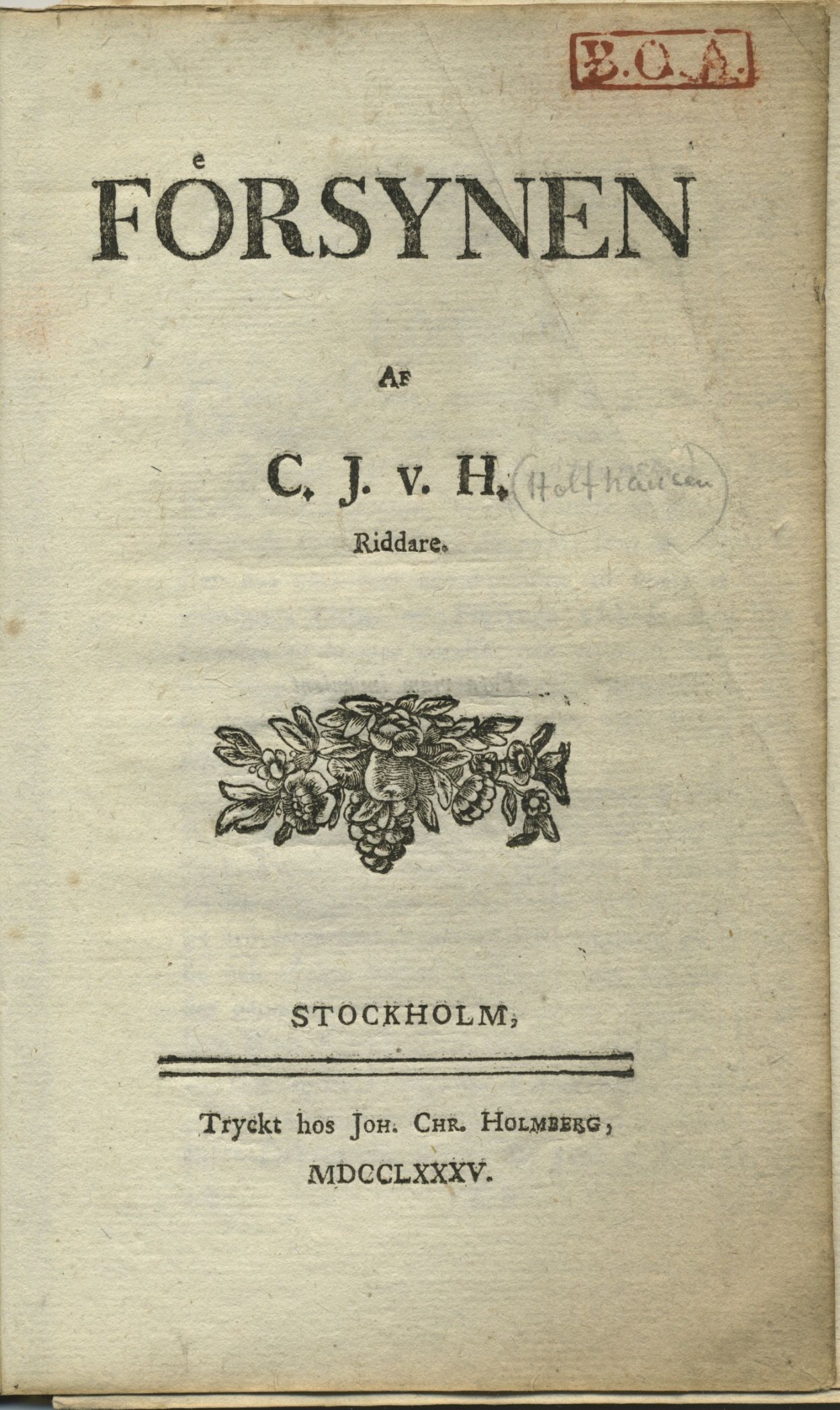Sthlm, J. C. Holmberg, 1785. 8:o. 16 s. Häftad i samtida marmorerat pappomslag. Med en del småfläckar. Sidorna 3-14 loss i häftningen. En gammal rödstpl ”B. O. A.” på titelbladet. Namnteckning på omslaget av S. A. Hollander.