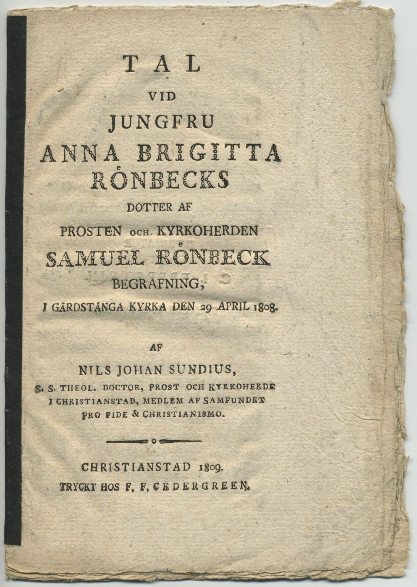 Tal vid jungfru Anna Brigitta Rönbecks dotter af prosten och kyrkoherden Samuel Rönbäck begrafning, i Gårdstånga kyrka den 29 april 1808.