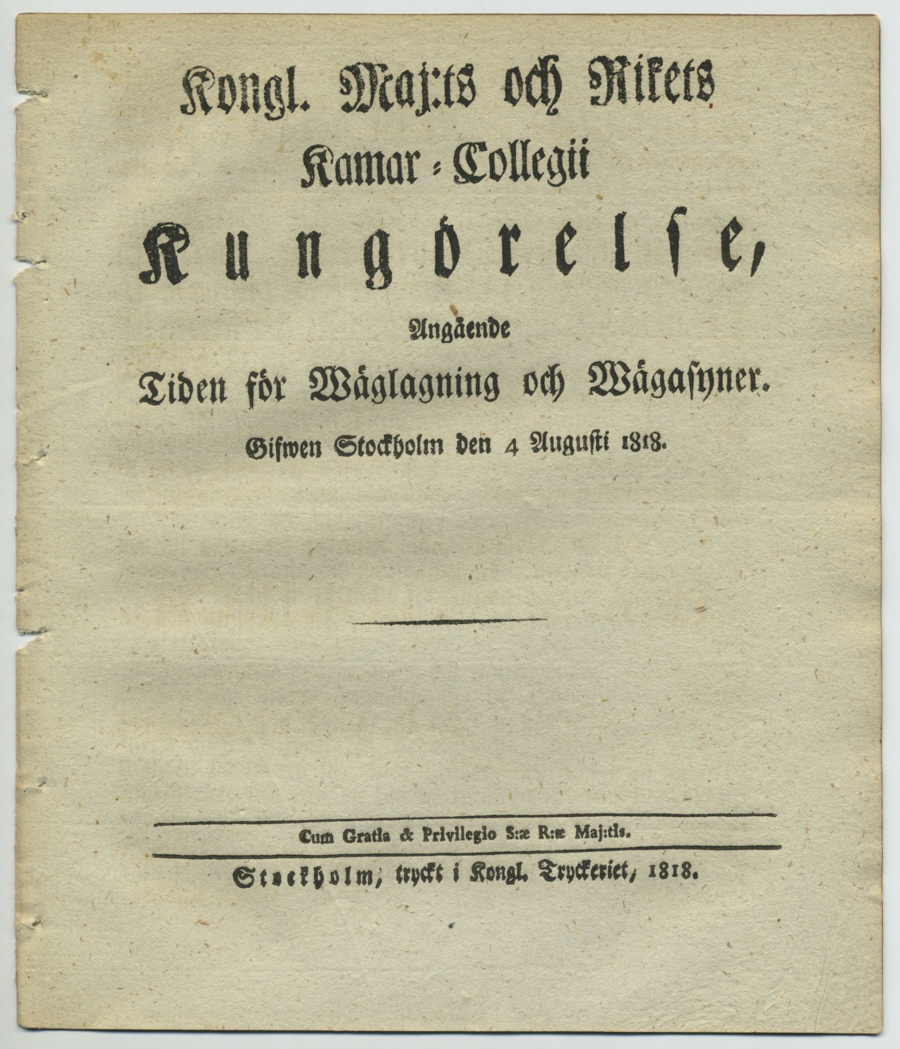 Kongl. maj:ts och rikets Kamar-collegii kungörelse, angående tiden för wäglagning och wägasyner. Gifwen Stockholm den 4 augusti 1818.
