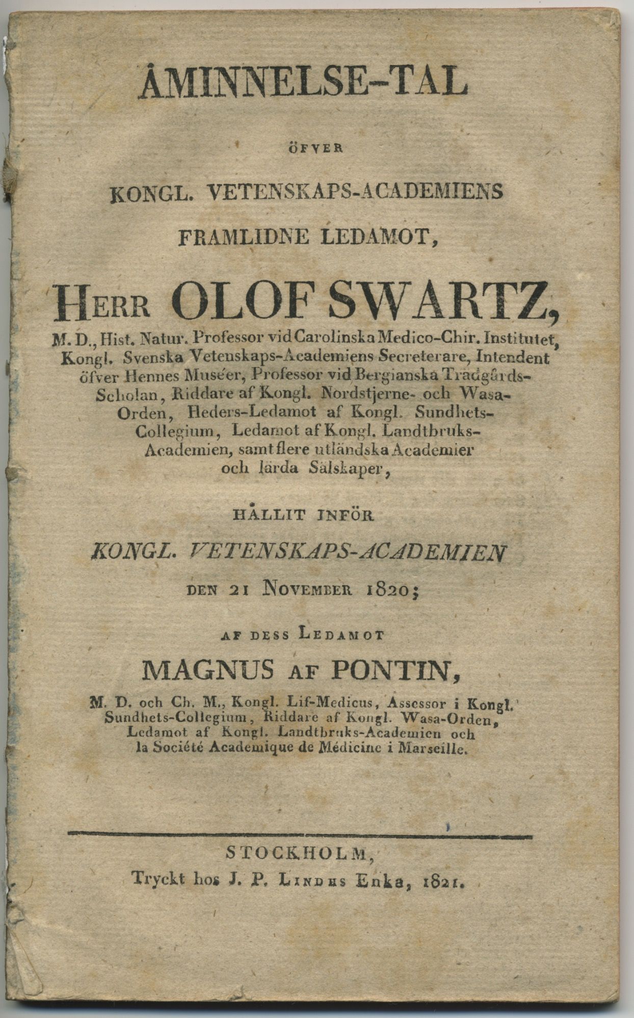 Åminnelse-tal öfver kongl. Vetenskaps-academiens framlidne ledamot, herr Olof Swartz, m.d., hist. natur. professor vid Carolinska medico-chir. institutet, kongl. svenska Vetenskaps-academiens secreterare, intendent öfver hennes muséer, professor vid Bergianska trädgårds-scholan, riddare af kongl. Nordstjerne- och Wasa-orden, heders-ledamot af kongl. Sundhets-collegium, ledamot af kongl. Landtbruks-academien, samt flere utländska academier och lärda sälskaper, hållit inför kongl. Vetenskaps-academien den 21 november 1820.