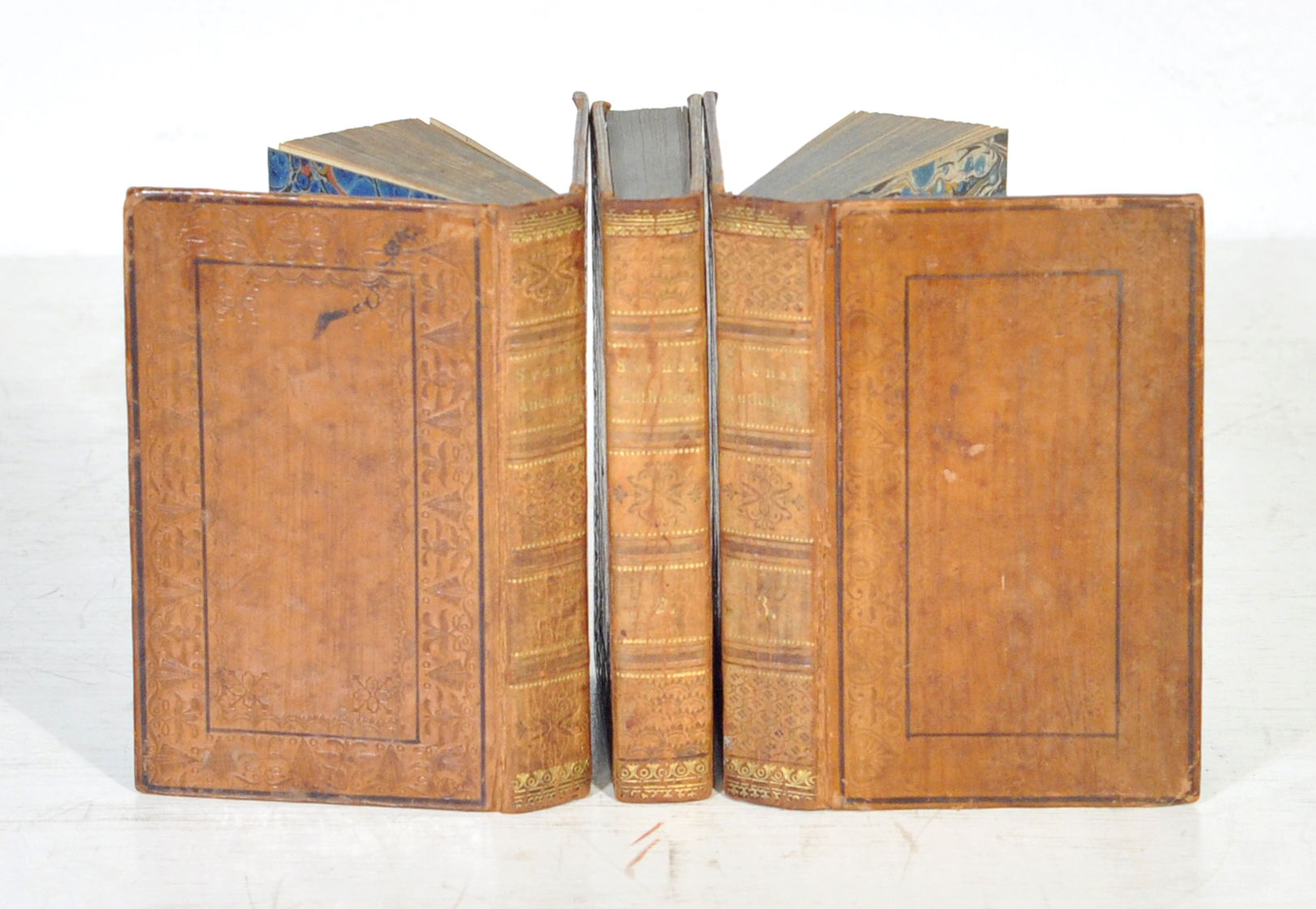 Sthlm, Ecksteinska boktryckeriet, 1820-28. 12:o. XXXVII,(1),462 + XVII,(1),516 + XIII,(1),560 s. Tre stiliga samtida bruna skinnbd med rik guld- och blindpressad dekor på rygg och pärmar, vilken delvis är oxiderad. Dekoren är lite olika utförd på de olika volymerna, vilka dock ger ett enhetligt intryck. Blåstänkta snitt. Banden är lite nötta, har lite flammiga ryggar med ytlig vertikal sprickbildning. Inlagorna med enstaka småfläckar. Första titelbladet lagerfläckigt. Del II med några små bläckfläckar på s. 114-18 och 133-34 samt en liten marginalreva i bladet s. 131-32. Bra och trevlig svit.