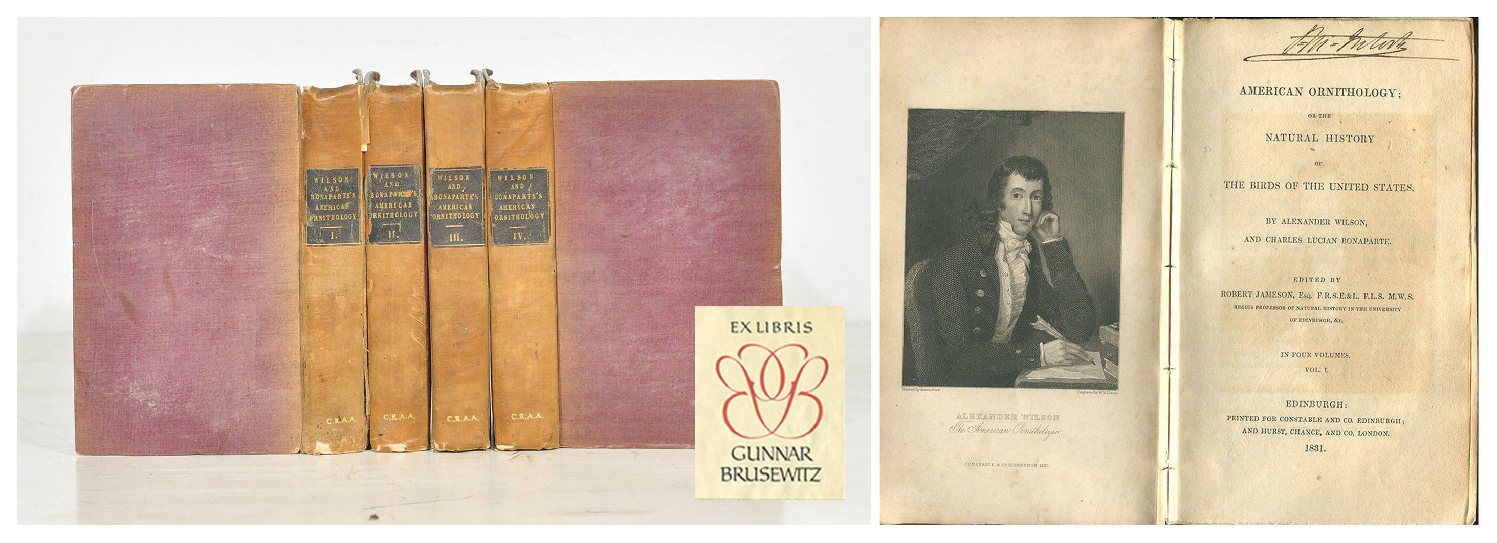 Nissen Die illustrierten Vogelbücher 994. Zimmer Catalogue of the Edward E. Ayer Ornithological Library II:682. Wood An introduction to the literature of vertebrate zoology 630 calling for a preliminary leaf in volume I, possibly due to another preliminary from volume II or IV being placed there, since Wood does not call for the unpaginated preliminaries in those volumes. Sabin A dictionary of books relating to America 104598, note. The first three volumes are devoted to a reprint of Wilson’s ”American Ornithology”, first published 1808-1814, and here with additional editorial comments by Jameson. A sketch of the life of Wilson by W. Hetherington is given in volume I. The fourth part contains a reprint of the first three volumes of Bonaparte’s ”American Ornithology” (1825-1833). On pp. 241-244 is a catalogue of the species described and figured by Audubon in his ”Ornithological Biography” (1831-1839) and ”Birds of America” (1827-1838). The work forms volumes LXVIII-LXXI of ”Constable’s Miscellany”. Alexander Wilson (1766-1813) was a Scottish ornithologist and poet, who emigrated to the US in 1794. In 1802 he decided to publish a book that would illustrate all of the North American birds, and thus travelled widely, observing and painting birds, and gathering subscribers for the coming book. The nine-volume work ”American Ornithology” illustrated 268 species, including descriptions of 26 new species. His 1810 meeting with Audubon probably inspired Audubon to publish his own work. Wilson also influenced many later artists and ornithologists. The nephew of Emperor Napoleon, Charles Lucian Bonaparte (1803-1857), was also a noted ornithologist. He discovered a new species of warbler which he later named after Alexander Wilson. Each volume has an illustrated title page with depictions of the scarlet ibis, the bald eagle, the wild turkey, and the night hawk. Volume I has a frontispiece portrait of Wilson.