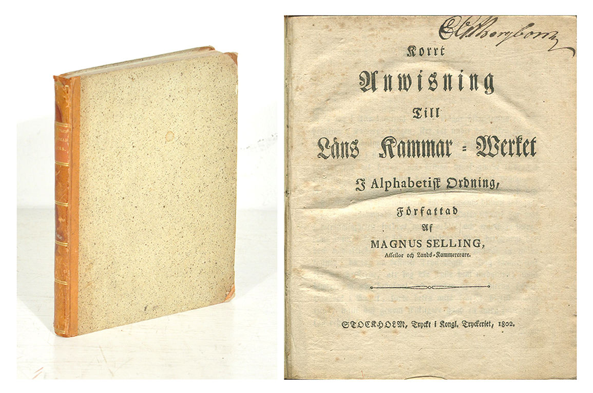 Sthlm, Kongl. tryckeriet, 1802. 4:o. (8),201,(1) s. Samtida lätt nött hfrbd med guldlinjerad rygg och tegelbrun titeletikett. Stänkta snitt. Två mörka fuktfläckar på ryggen. Ställvis lagerfläckig. Bläckfläckar i övre hörnet på s. 92. Namnteckning C. G. Bergbom på titelbladet.