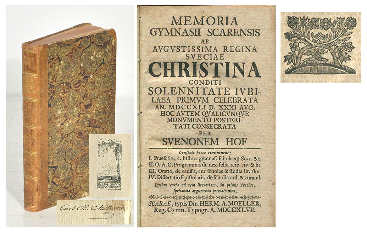 Warmholtz Bibliotheca historica Sueo-Gothica 9133. Sallander Litteratur om Västergötland 412: ”sällsynt”. Arbetet är en dokumentation av festligheterna vid Skara gymnasiums hundraårsjubileum. På sidan 23 ett deltitelblad till Olaus Odhelius jubileumstal över drottning Kristina med inledande gymnasieprogram daterat den 20 augusti 1741. Sidan 89 är ett deltitelblad till Sven Hofs ”Dissertatio epistolaris, de scholis ordinandis et curandis”. I den senare pläderar Hof, enligt H. Sandblad, ”för de bokliga studiernas inriktning på sådant som gagnar samhället, samtidigt som den tidigt nog bör anpassas efter den individuella läggningen”. Sven Hof (1703-86) var lektor vid Skara gymnasium och bidrog väsentligt till förbättrandet av dess bibliotek, till vilket han även donerade sin boksamling. Hof gjorde även viktiga insatser inom den svenska språkvetenskapen. Carl Henrik Ekstrand (1803-66) var biblioteksamanuens och utgav bland annat Uppsala akademies matrikel 1832. Han var gift med Beata Catharina Sederholm, änka efter Alexander Magnus Sederholm på Nävekvarns bruk. Efter Ekstrands död ärvdes biblioteket av hans olika styvbarn i familjerna Bowallius och Sederholm.