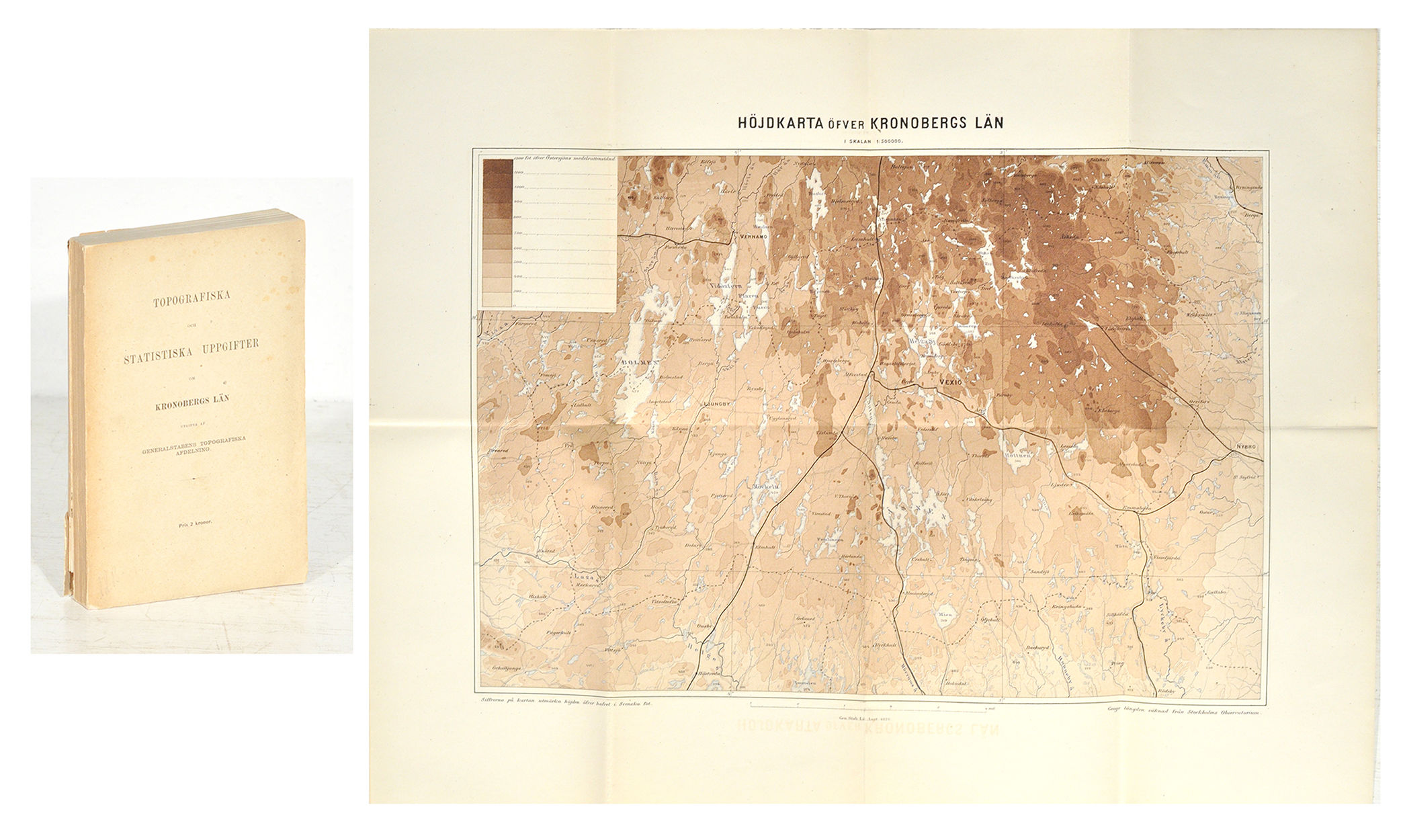 Kartorna är dels en höjdkarta över Kronobergs län, dels en som visar befolkningstätheten i Kronobergs län vid slutet av 1874. Med en rikedom av uppgifter om allt från länets gränser, vegetation, folklynne, fattigvård, brännvinsbränning, jakt, fiske, skogshushållning, kommunikationer till beskrivning över Växjö och Ljungby samt avslutande tabeller av länets indelning avseende lagskipning, skatteuppbörd etc.