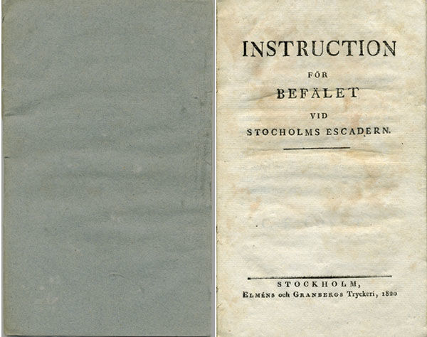 Sthlm, Elméns och Granbergs tryckeri, 1820. 8:o. 66,(1) s. + Instruction för befälet vid sjö-artilleri-regementet i Stockholm. Sthlm, Elméns och Granbergs tryckeri, 1821. 8:o. 39 s. Häftad i samtida gråpappomslag. Ngt fuktfläckig och -bucklig inledningsvis. Lite svag i häftningen och några blad loss.