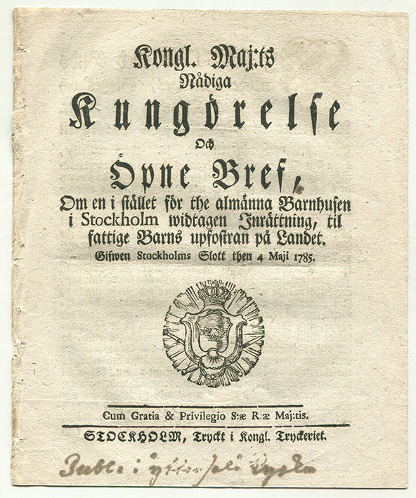 Kongl. maj:ts nådiga kungörelse och öpne bref, om en i stället för the almänna barnhusen i Stockholm widtagen inrättning, til fattige barns upfostran på landet. Gifwen Stockholms slott then 4 maji 1785.
