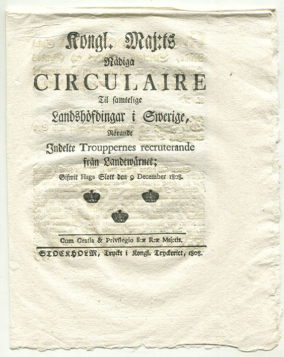 Kongl. maj:ts nådiga circulaire til samtelige landshöfdingar i Swerige, rörande indelte trouppernes recruterande från landtwärnet; gifwit Haga slott den 9 december 1808.