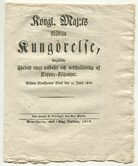 Kongl. maj:ts nådiga kungörelse, angående förbud emot utförsel och nedsmältning af koppar-skiljemynt. Gifwen Stockholms slott den 19 junii 1816.