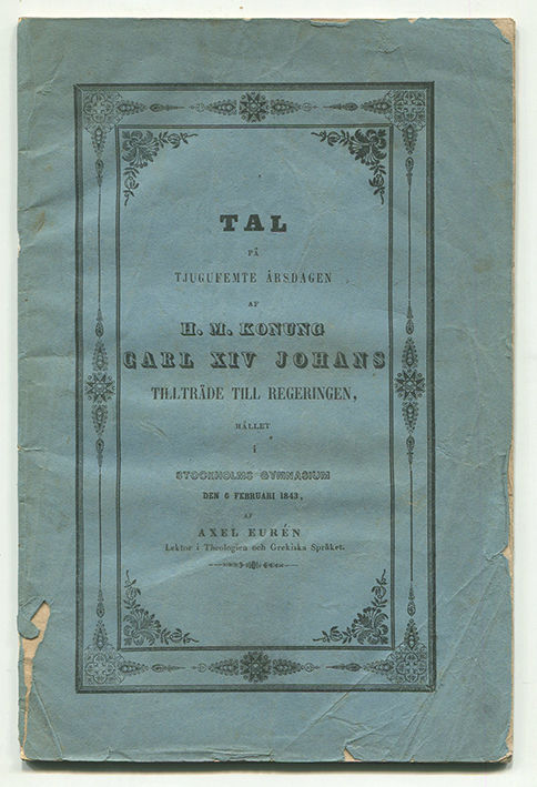 Sthlm, P. A. Norstedt & söner, 1843. 8:o. 29,(3 blanka) s. Häftad i tryckt blått omslag, det främre med smånaggar samt reva nedtill i ryggen. Lagerfläckig, mest på de första sidorna.