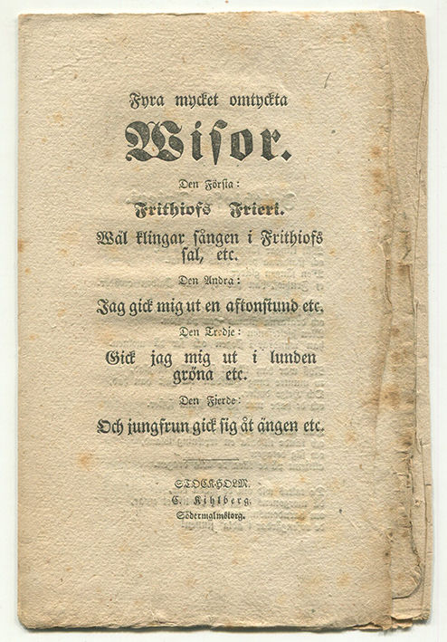 På C. Kihlbergs förlag. Den första visan av Esaias Tegnér, den andra är en traditionell folkvisa med stor spridning och som sjungits in i modern tid och den fjärde upptecknades av Richard Dybeck 1827 och publicerades i ”Runa” 1842.