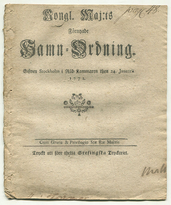 (Sthlm), förr thetta Grefingska tryckeriet, (1771). 4:o. (12) s. Tagen ur band. Inlagan något gulnad. Med gammal bläcknumrering 48 och spår av äldre beskuren tillskrift på titelbladet som även har småskador upptill vid ryggen och liten reva. Några lätta trycksvärtesolkigheter.