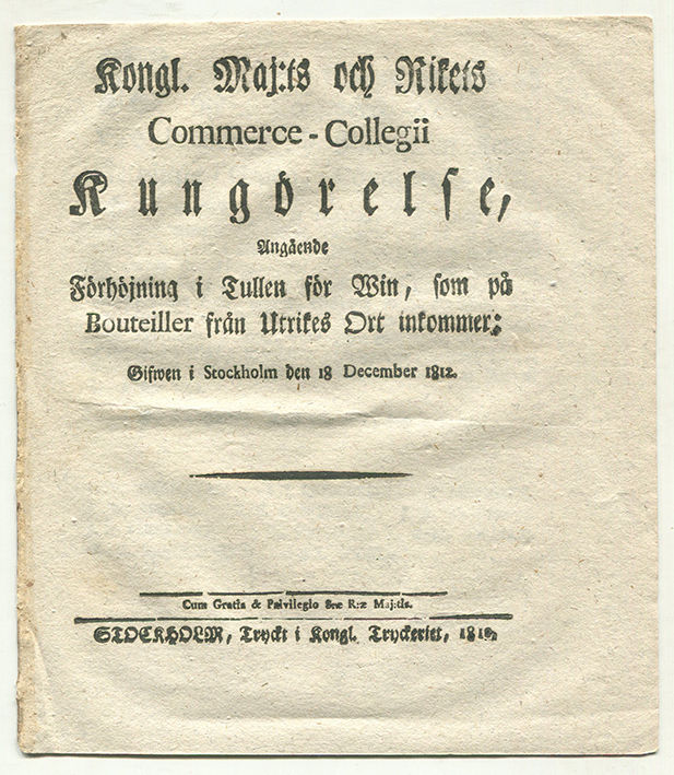 Kongl. maj:ts och rikets Commerce-collegii kungörelse, angående förhöjning i tullen för win, som på bouteiller från utrikes ort inkommer; gifwen i Stockholm den 18 december 1812.