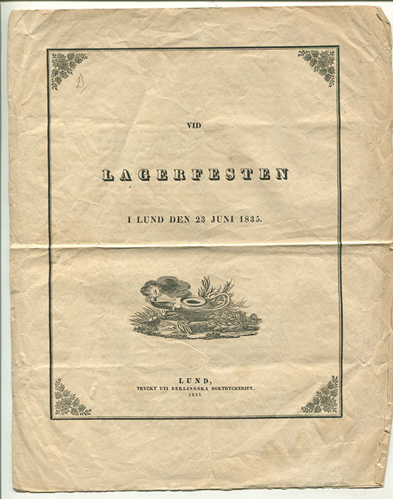 Lund, Berlingska boktryckeriet, 1835. 4:o. (4) s. Titelsidan inom typografiskt ramverk och med vinjett. Vikt på båda ledderna. Lite skrynklig, Enstaka lager- och småfläckar samt en svag fuktrand. Första sidan med en diskret duplettmarkering i blyerts.