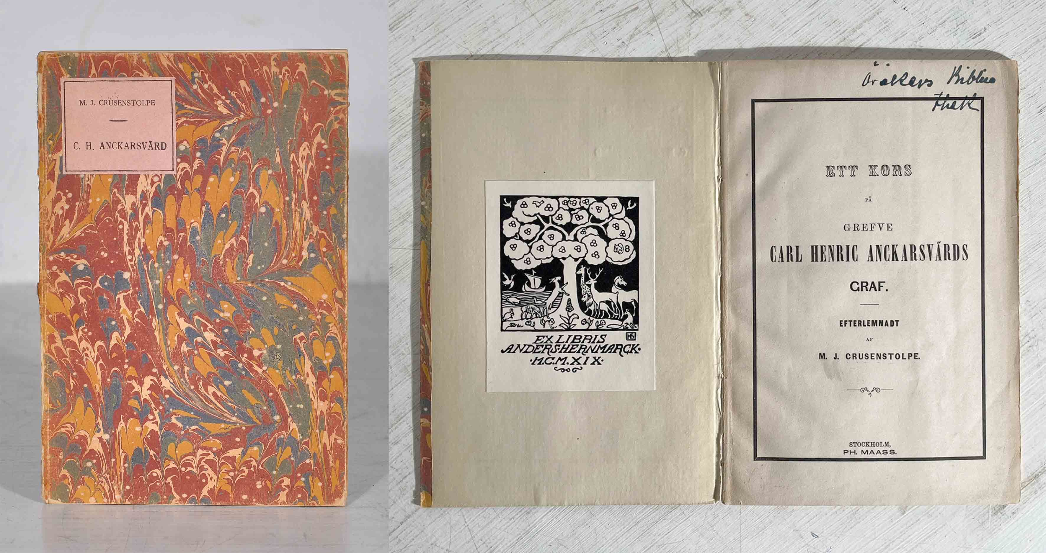 Sthlm, I. Marcus, 1865. 8:o. 46 s. Marmorerat pappbd från 1900-talets första hälft med tryckt titeletikett på rosa papper (Hedberg, osignerat). Inlagan jämnskuren med pärmarna. Det tryckta omslaget medbundet. Ryggen på bandet sliten och delvis defekt. Främre omslag med tillskrift ”Öråkers bibliothek”. Exlibris Anders Hernmarck och med hans blyertsanteckning daterad 1962 på s. 44.