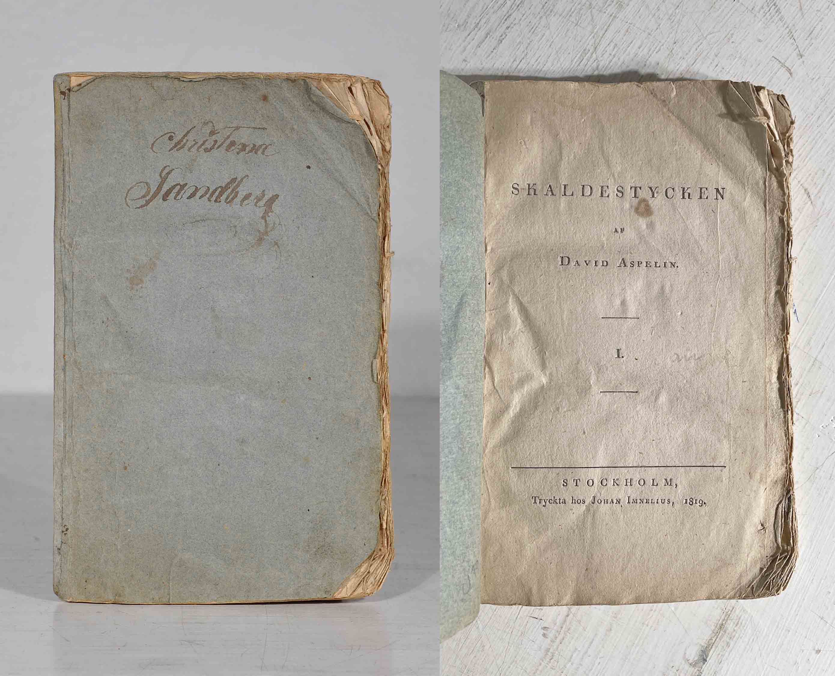 Sthlm, J. Imnelius, 1819. 8:o. (4),99,(1 blank,1) s. Häftad och oskuren i samtida gråpappersomslag. Delvis ganska solkig med spridda fläckar och fuktränder, bl.a. en liten men störande fläck på titelbladet och fuktrosor mot slutet. Rättelserna är införda med blyerts i texten. Någon bläcknotering och en del bläckstänk. Med Christina Sandbergs lite kladdiga samtida namnteckning på främre omslag.