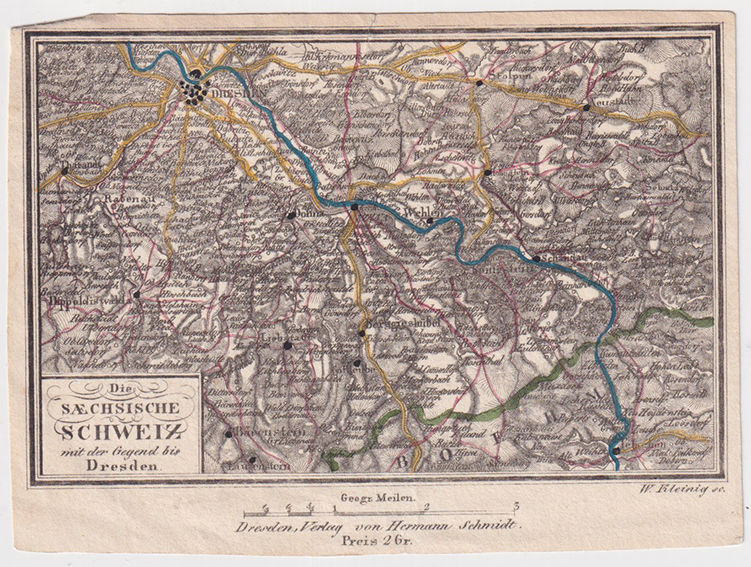 Die Sæchsische Schweiz mit der Gegend bis Dresden. Gränskolorerad grav. karta.