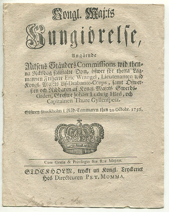 Kongl. maj:ts kungiörelse, angående riksens ständers commissions wid thenna riksdag faststälte dom, öfwer för thetta lagmannen friherre Eric Wrangel, lieutenanten wid kongl. maj:ts lif-drabante-corps, samt öfwersten och riddaren af kongl. maj:ts Swerds-orden, grefwe Johan Ludvig Hård, och capitainen Thure Gyllenspetz. Gifwen Stockholm i råd-cammaren then 20 octobr. 1756.