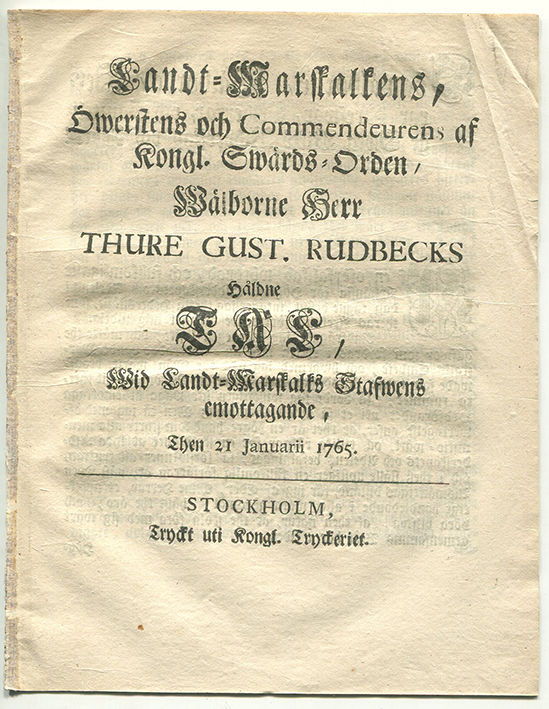 Landt-marskalkens, öwerstens och commendeurens af kongl. Swärds-orden, wälborne herr Thure Gust. Rudbecks håldne tal, wid landt-marskalks stafwens emottagande, then 21 januarii 1765.