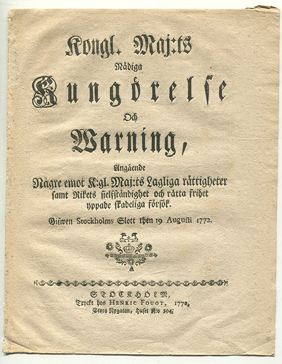 Kongl. maj:ts nådiga kungörelse och warning, angående någre emot k:gl. maj:ts lagliga rättigheter samt rikets sielfständighet och rätta frihet yppade skadeliga försök. Gifwen Stockholms slott then 19 augusti 1772.