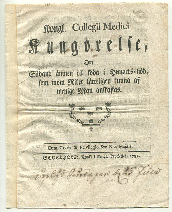 Kongl. Collegii medici kungörelse, om sådane ämnen til föda i hungers-nöd, som inom riket lätteligen kunna af menige man anskaffas.