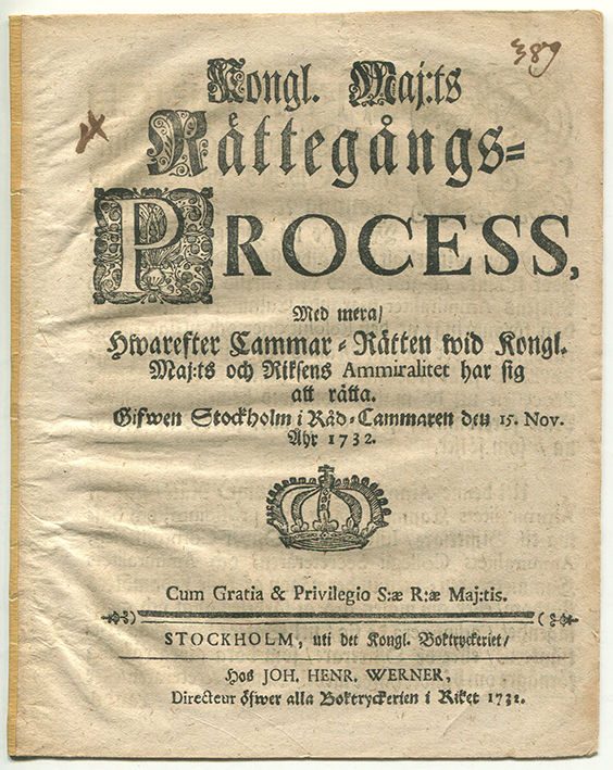Kongl. maj:ts rättegångs-process, med mera/ hwarefter Cammar-rätten wid kongl. maj:ts och riksens Ammiralitet har sig att rätta. Gifwen Stockholm i råd-cammaren den 15 nov. åhr 1732.