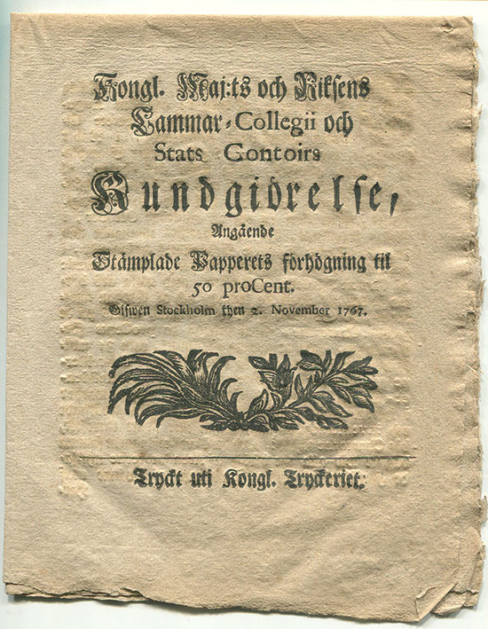 Kongl. maj:ts och riksens Cammar-collegii och Stats contoirs kundgiörelse, angående stämplade papperets förhögning til 50 procent. Gifwen Stockholm then 2 november 1767.