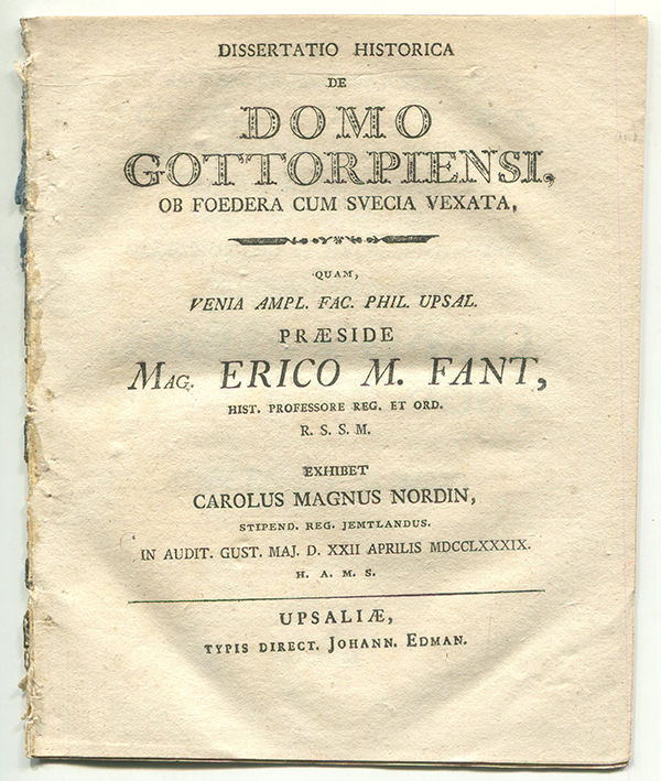 Marklin Catalogus disputationum 130. Setterwall Svensk historisk bibliografi 512. Tryckta dedikationer till bland andra Fredrik Pontus De la Gardie, J. M. af Nordin och Carl Gustaf Nordin. Om det Gottorpska kungahuset i Sverige. På sista sidan ett litet släktträd från Christian I till Adolf Fredrik.