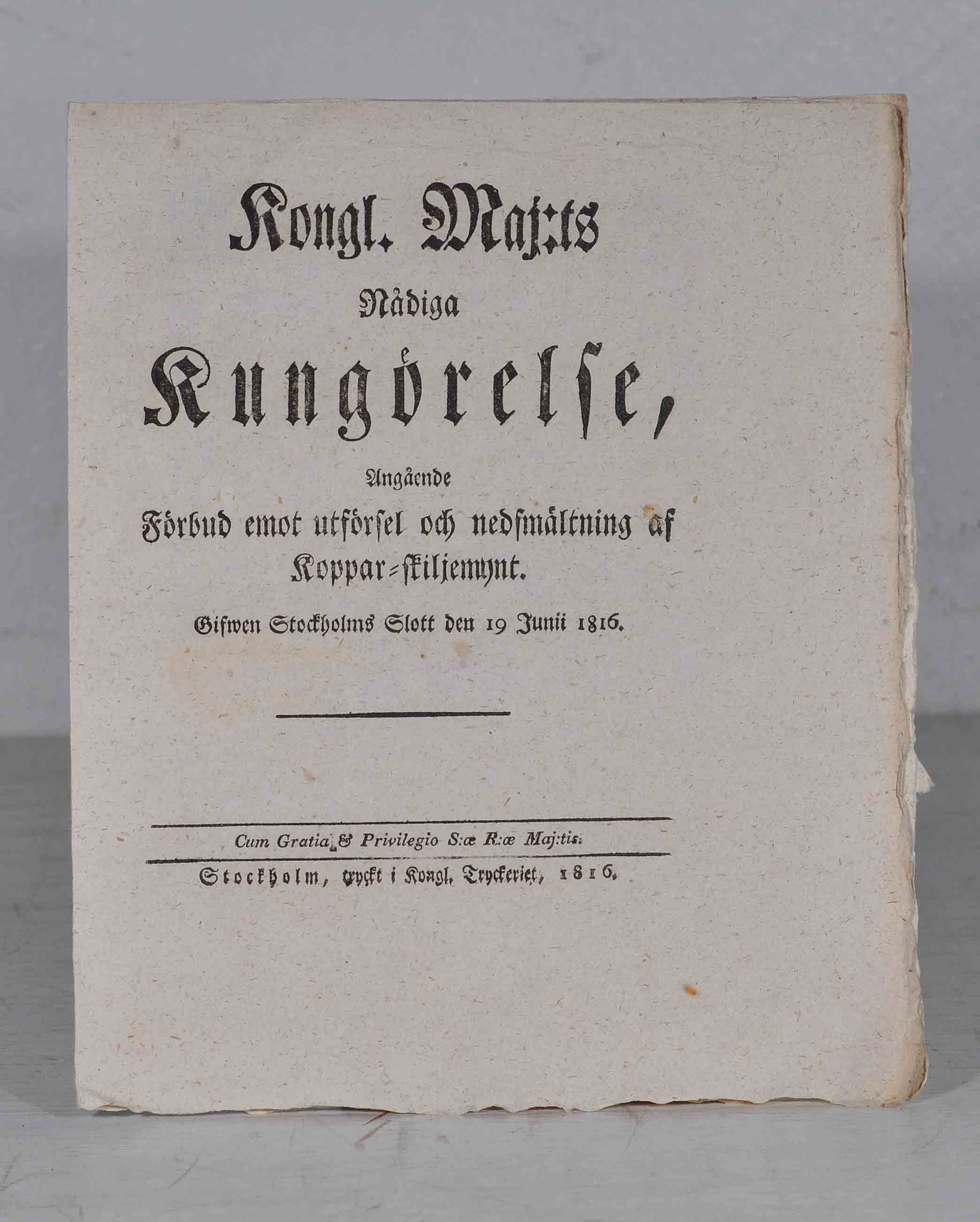 Kongl. maj:ts nådiga kungörelse, angående förbud emot utförsel och nedsmältning af koppar-skiljemynt. Gifwen Stockholms slott den 19 junii 1816.